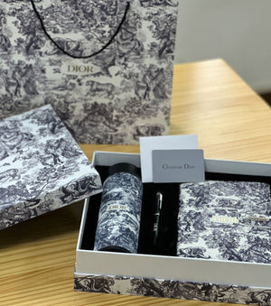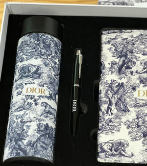 Комплект с отпечатано лого, съдържащ тефтер, химикалка и термос, изработени от неръждаема стомана 316.